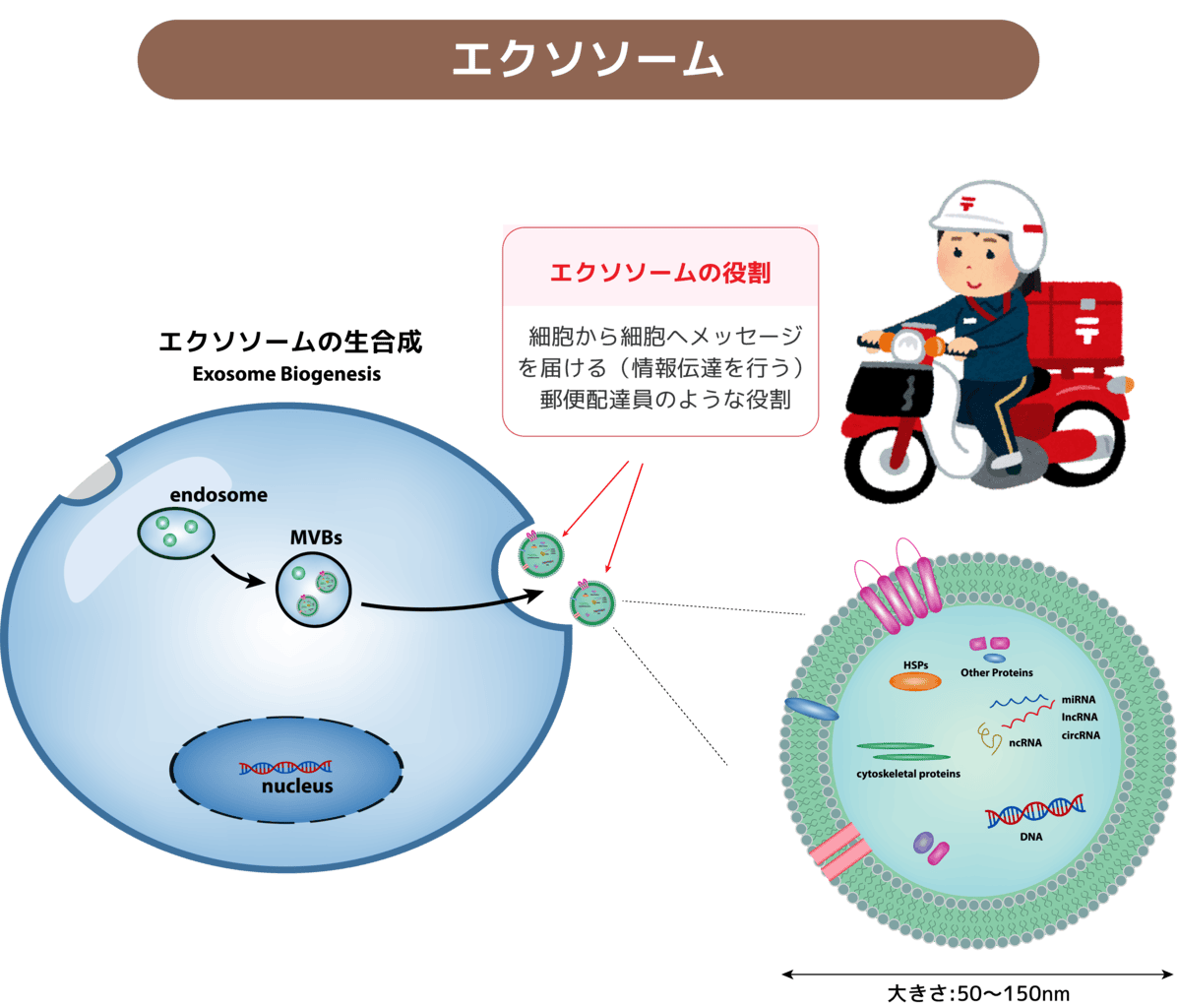エクソソームは、私たちの細胞が作り出す「小さな泡(細胞外小胞)」です。細胞が他の細胞と情報を共有するために使われます。